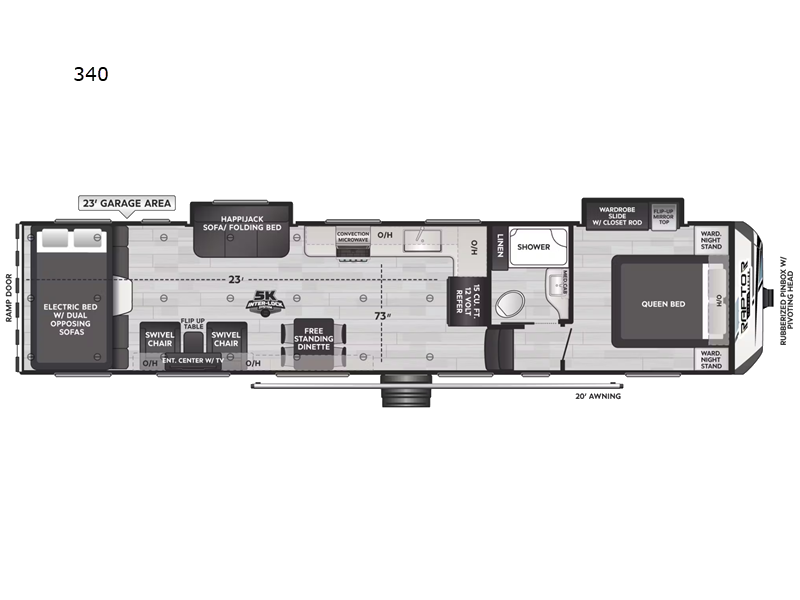 You won't be left wanting for comfort with this capable toy hauler! There is an impressive 23' garage area for your toys, plus dual opposing sofas and an electric bed for guests to sleep on. There is even an additional sleeping space found on the Happijac sofa/folding bed within the living room slide out! After a day of adventuring, you can clean up in the full bath that includes a shower with a seat, then head to the kitchen to prepare dinner in the full kitchen. There is a free-standing dinette to dine at and dual swivel chairs with a flip-up table for even more seating space. You'll feel right at home in the front private bedroom with its queen bed, wardrobe slide with a closet rod and flip-up mirror top, plus dual nightstands and wardrobes on either side of the bed to keep everything tidy!